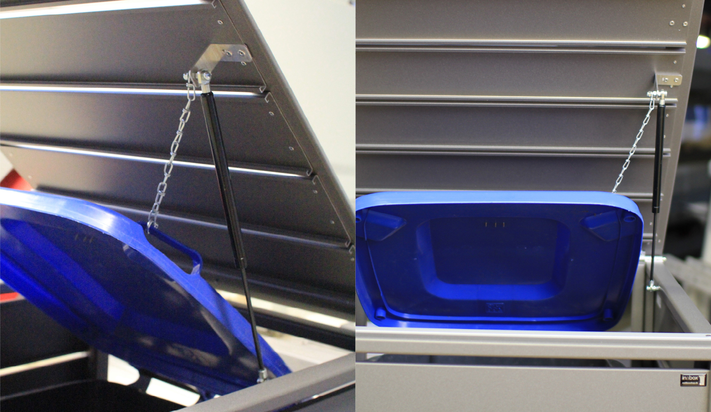 Die abschließbare Version der Mülltonnenbox besteht aus einem inneren Klemmriegel für den Deckel.